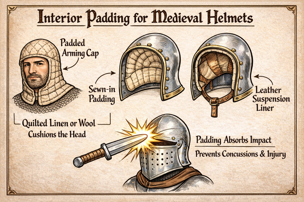 Medieval helmets typically included interior padding or a padded cap worn underneath to cushion the wearer from the hard metal shell. Knights commonly wore a quilted arming cap made of linen, wool, or layered cloth, which absorbed sweat, reduced friction, and helped the helmet fit securely. In some later helmet designs, especially during the 14th and 15th centuries, padding or a leather suspension liner was attached inside the helmet itself to create space between the metal and the skull. This cushioning was essential because it helped absorb shock from blows, reduce the risk of concussion, and distribute impact forces across the head. Without such padding, even minor strikes against the metal helm could transfer significant force directly to the wearer’s head, making interior cushioning a critical component of medieval protective armor.